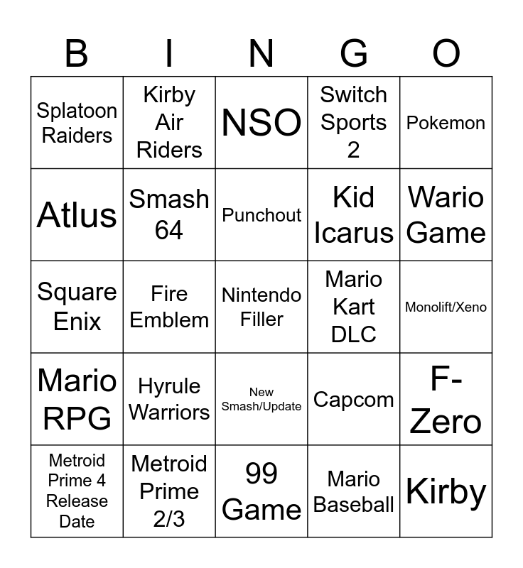 This bingo card has a free space and 24 words: Metroid Prime 4 Release Date, Hyrule Warriors, Punchout, Mario Baseball, Pokemon, Splatoon Raiders, Kirby Air Riders, NSO, Mario Kart DLC, Monolift/Xeno, Square Enix, Smash 64, Capcom, F-Zero, Atlus, Metroid Prime 2/3, 99 Game, Switch Sports 2, Wario Game, Mario RPG, Fire Emblem, New Smash/Update, Kid Icarus and Kirby.