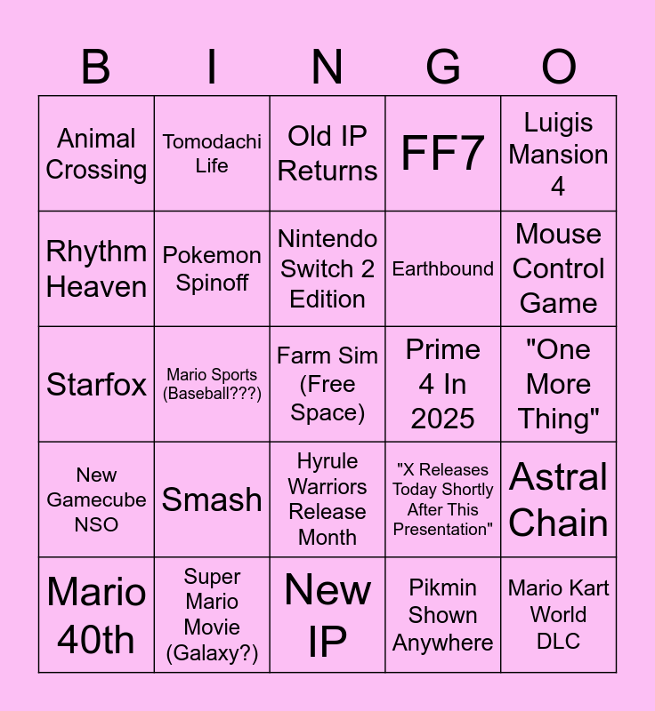 This bingo card has a free space and 24 words: Smash, Super Mario Movie (Galaxy?), Nintendo Switch 2 Edition, Mario 40th, Luigis Mansion 4, Animal Crossing, Rhythm Heaven, Tomodachi Life, Prime 4 In 2025, Hyrule Warriors Release Month, Earthbound, Starfox, "X Releases Today Shortly After This Presentation", Astral Chain, Pokemon Spinoff, Pikmin Shown Anywhere, "One More Thing", Old IP Returns, Mouse Control Game, Mario Sports (Baseball???), Mario Kart World DLC, New Gamecube NSO, FF7 and New IP.