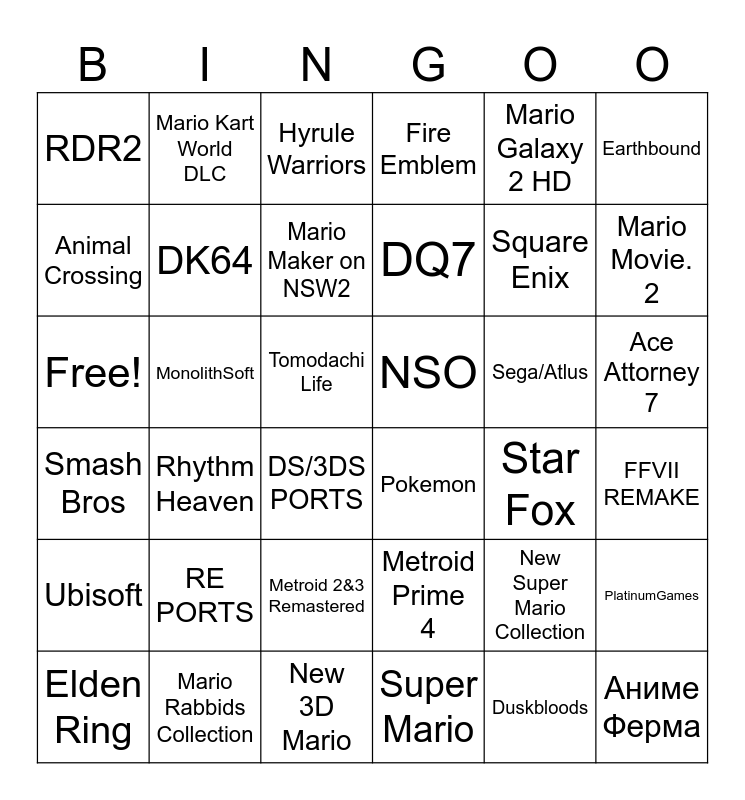 This bingo card has 36 words: Metroid Prime 4, Metroid 2&3 Remastered, Super Mario, Animal Crossing, Smash Bros, NSO, DK64, New 3D Mario, Mario Galaxy 2 HD, New Super Mario Collection, Mario Movie. 2, Fire Emblem, PlatinumGames, MonolithSoft, DQ7, RDR2, Ubisoft, Sega/Atlus, Free!, Hyrule Warriors, Tomodachi Life, Rhythm Heaven, Pokemon, DS/3DS PORTS, Star Fox, Mario Kart World DLC, Square Enix, Mario Rabbids Collection, Mario Maker on NSW2, Earthbound, Аниме Ферма, Elden Ring, FFVII REMAKE, Ace Attorney 7, RE PORTS and Duskbloods.