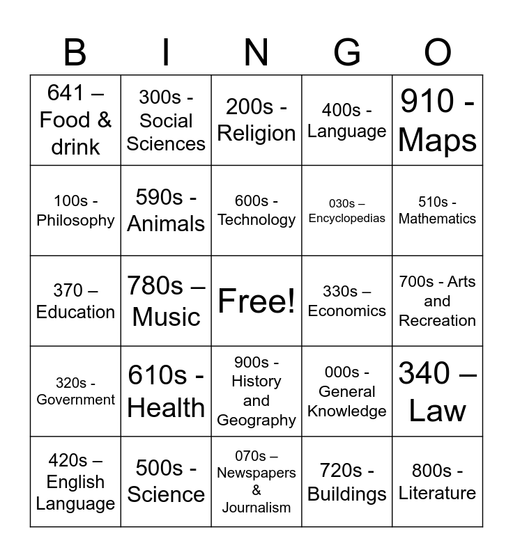 This bingo card has a free space and 27 words: 000s - General Knowledge, 020s – Library Science, 030s – Encyclopedias, 070s – Newspapers & Journalism, 100s - Philosophy, 200s - Religion, 300s - Social Sciences, 320s - Government, 330s – Economics, 340 – Law, 370 – Education, 400s - Language, 420s – English Language, 500s - Science, 510s - Mathematics, 530s – Physics, 590s - Animals, 600s - Technology, 610s - Health, 641 – Food & drink, 700s - Arts and Recreation, 720s - Buildings, 780s – Music, 800s - Literature, 900s - History and Geography, 910 - Maps and 920s – Biography.