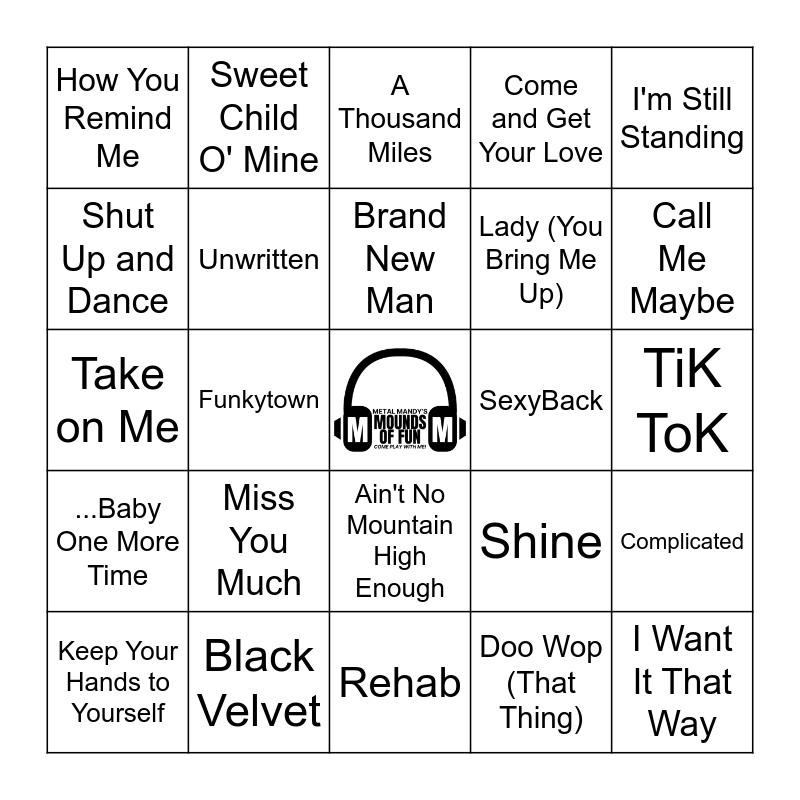 This bingo card has a free space and 75 words: Man! I Feel Like A Woman!, Kiss, A Thousand Miles, Mr. Brightside, Jessie's Girl, Song 2, Don't You Want Me, The Sweet Escape, Come On Eileen, Don't Stop Believin', Celebration, Bohemian Rhapsody, Brand New Man, Shut Up and Dance, What's Love Got to Do with It, Funkytown, All The Small Things, I Want It That Way, Dancing Queen, I'm Still Standing, Hey There Delilah, Take on Me, Unwritten, Sweet Child O' Mine, Come and Get Your Love, Fantasy, Before He Cheats, Push It, Take Me Home, Country Roads, Crazy, It's Not Unusual, What's Up?, Dancing In the Sheets, Shine, Call Me Maybe, Lady (You Bring Me Up), You Belong With Me, Hot Stuff, TiK ToK, Doo Wop (That Thing), It's Tricky, Baby Got Back, Fireball, Jump Around, This Is How We Do It, Step by Step, Keep Your Hands to Yourself, How You Remind Me, Love Shack, Everybody (Backstreet's Back), Sweet Dreams (Are Made of This), Ain't No Mountain High Enough, Heartbreaker, Boogie Shoes, Venus, Stayin' Alive, Yeah!, Single Ladies (Put a Ring on It), Bye Bye Bye, Don't Cha, Miss You Much, Fire Burning, What Is Love, It Wasn't Me, Superstition, SexyBack, What Have You Done For Me Lately, Livin' la Vida Loca, That Don't Impress Me Much, Complicated, ...Baby One More Time, Black Velvet, Piano Man, Rehab and Could You Be Loved.