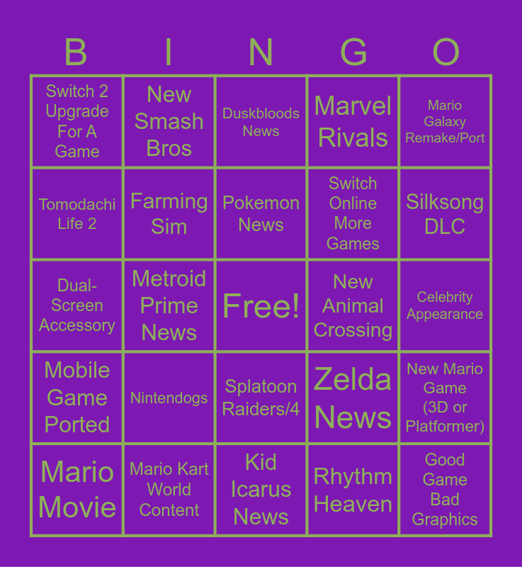 This bingo card has a free space and 24 words: Nintendogs, Mario Kart World Content, Pokemon News, Mario Movie, Mario Galaxy Remake/Port, Switch 2 Upgrade For A Game, Tomodachi Life 2, New Smash Bros, New Animal Crossing, Splatoon Raiders/4, Switch Online More Games, Dual-Screen Accessory, Zelda News, New Mario Game (3D or Platformer), Farming Sim, Rhythm Heaven, Celebrity Appearance, Duskbloods News, Silksong DLC, Metroid Prime News, Good Game Bad Graphics, Mobile Game Ported, Marvel Rivals and Kid Icarus News.