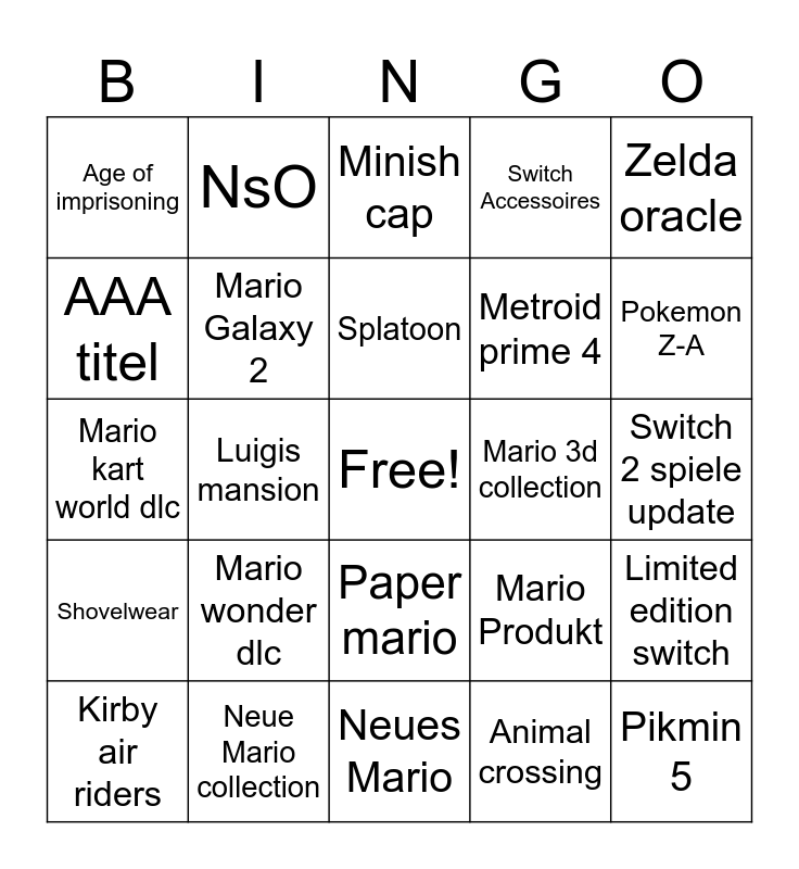 This bingo card has a free space and 24 words: Mario wonder dlc, Neue Mario collection, Splatoon, Kirby air riders, Zelda oracle, Age of imprisoning, AAA titel, NsO, Mario 3d collection, Paper mario, Metroid prime 4, Mario kart world dlc, Mario Produkt, Limited edition switch, Mario Galaxy 2, Animal crossing, Switch 2 spiele update, Minish cap, Pokemon Z-A, Luigis mansion, Pikmin 5, Shovelwear, Switch Accessoires and Neues Mario.