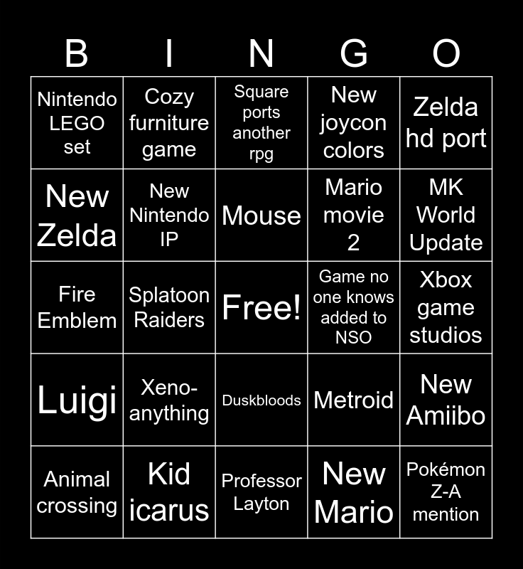 This bingo card has a free space and 24 words: Xeno-anything, Kid icarus, Mouse, Animal crossing, Zelda hd port, Nintendo LEGO set, New Zelda, Cozy furniture game, Game no one knows added to NSO, Duskbloods, Mario movie 2, Fire Emblem, Metroid, New Amiibo, New Nintendo IP, New Mario, Xbox game studios, Square ports another rpg, MK World Update, Splatoon Raiders, Pokémon Z-A mention, Luigi, New joycon colors and Professor Layton.