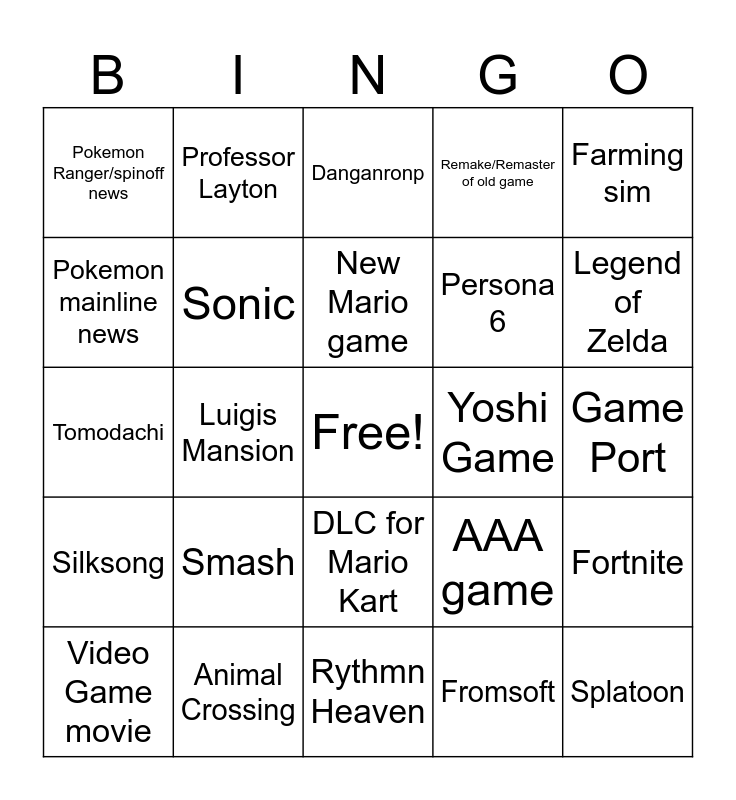 This bingo card has a free space and 24 words: Smash, Animal Crossing, New Mario game, Video Game movie, Farming sim, Pokemon Ranger/spinoff news, Pokemon mainline news, Professor Layton, Yoshi Game, DLC for Mario Kart, Persona 6, Tomodachi, AAA game, Fortnite, Sonic, Fromsoft, Game Port, Danganronp, Legend of Zelda, Luigis Mansion, Splatoon, Silksong, Remake/Remaster of old game and Rythmn Heaven.