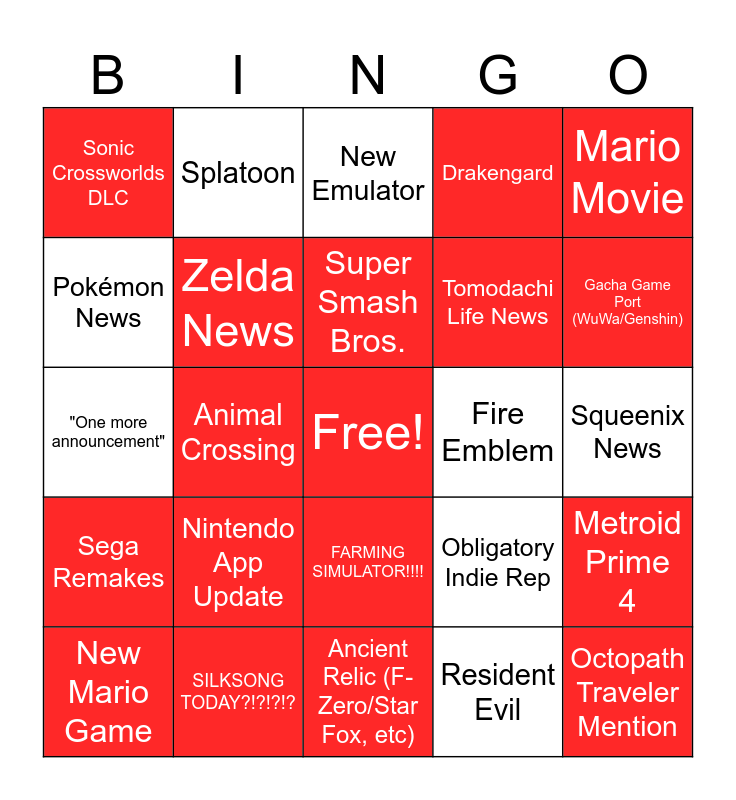 This bingo card has a free space and 24 words: Nintendo App Update, SILKSONG TODAY?!?!?!?, Super Smash Bros., New Mario Game, Mario Movie, Sonic Crossworlds DLC, Pokémon News, Splatoon, Fire Emblem, FARMING SIMULATOR!!!!, Tomodachi Life News, "One more announcement", Obligatory Indie Rep, Metroid Prime 4, Zelda News, Resident Evil, Squeenix News, New Emulator, Gacha Game Port (WuWa/Genshin), Animal Crossing, Octopath Traveler Mention, Sega Remakes, Drakengard and Ancient Relic (F-Zero/Star Fox, etc).
