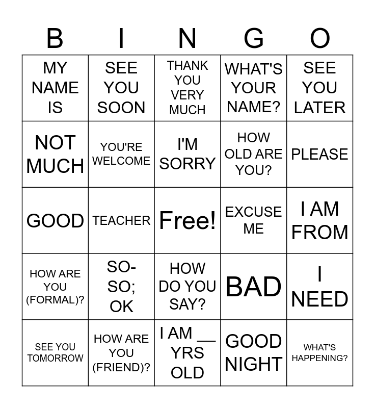 This bingo card has a free space and 34 words: GOODBYE, GOOD NIGHT, GOOD AFTERNOON, GOOD MORNING, HOW ARE YOU (FORMAL)?, YOU'RE WELCOME, SEE YOU LATER, SEE YOU TOMORROW, SEE YOU SOON, HI; HELLO, I'M SORRY, THANK YOU VERY MUCH, NICE TO MEET YOU, SEE YA, EXCUSE ME, PLEASE, HOW ARE YOU (FRIEND)?, GOOD, SO-SO; OK, BAD, HOW DO YOU SAY?, HOW DO YOU SPELL?, MY NAME IS, I AM FROM, I AM __ YRS OLD, WHAT'S HAPPENING?, WHAT'S YOUR NAME?, WHERE ARE YOU FROM?, HOW OLD ARE YOU?, NOT MUCH, CAN I GO TO THE BATHROOM?, TEACHER, I NEED and AN EMERGENCY.