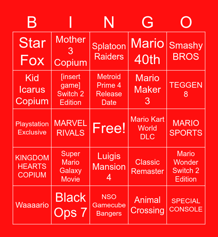 This bingo card has a free space and 24 words: Super Mario Galaxy Movie, Black Ops 7, Metroid Prime 4 Release Date, Waaaario, Smashy BROS, Star Fox, Kid Icarus Copium, Mother 3 Copium, Mario Kart World DLC, Luigis Mansion 4, Mario Maker 3, Playstation Exclusive, Classic Remaster, Mario Wonder Switch 2 Edition, [insert game] Switch 2 Edition, Animal Crossing, MARIO SPORTS, Splatoon Raiders, TEGGEN 8, MARVEL RIVALS, SPECIAL CONSOLE, KINGDOM HEARTS COPIUM, Mario 40th and NSO Gamecube Bangers.