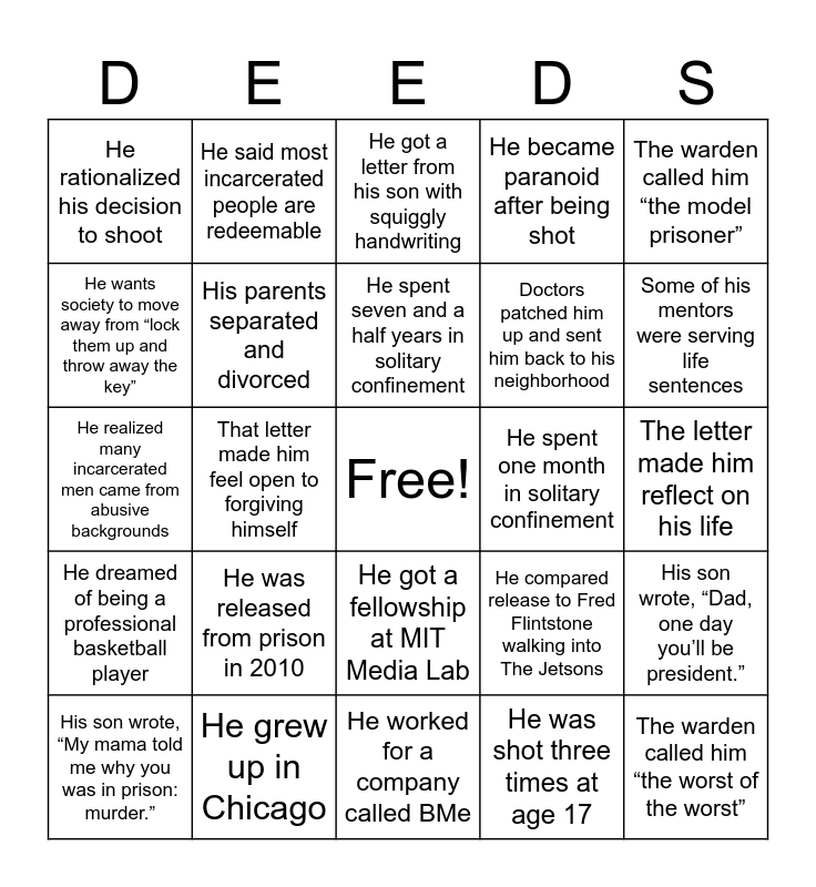 This bingo card has a free space and 58 words: At age 19, he shot and killed a man, He grew up in Chicago, He was a young drug dealer with a quick temper, He dreamed of being a professional basketball player, He was shot three times at age 17, He was shot once at age 15, His parents separated and divorced, His friend rushed him to the hospital, Doctors patched him up and sent him back to his neighborhood, No one counseled him or told him he would be okay, He became paranoid after being shot, He later became deeply religious in prison, Fourteen months later, he fired the shots that killed a man, He entered prison bitter and angry, He blamed his parents and the system, He rationalized his decision to shoot, The warden called him “the worst of the worst”, The warden called him “the model prisoner”, He ran black market stores in prison, He spent seven and a half years in solitary confinement, He spent one month in solitary confinement, He got a letter from his son with squiggly handwriting, His son wrote, “My mama told me why you was in prison: murder.”, His son wrote, “Dad, one day you’ll be president.”, His son told him, “Don’t kill. Jesus watches what you do.”, The letter made him reflect on his life, He remembered a quote from Socrates in Plato’s Apology, He had mentors in prison, Some of his mentors were serving life sentences, His mentors were famous athletes who visited the prison, He discovered black poets, authors, and philosophers, He read Malcolm X’s autobiography, He read Harry Potter and said it changed his life, His father stood by him for 19 years, He met an amazing woman who taught him to love himself, He started keeping a journal, He received a letter of forgiveness from a victim’s relative, That letter made him feel open to forgiving himself, He realized many incarcerated men came from abusive backgrounds, He wanted to help others turn their lives around, He was released from prison in 2010, He was released from prison in 2005, He compared release to Fred Flintstone walking into The Jetsons, He was amazed by new phone technology, He thought “K” in texting meant something bad, He thought “LOL” meant “lots of love”, He accidentally texted “FU” as a joke, He got a fellowship at MIT Media Lab, He worked for a company called BMe, He taught at the University of Michigan, He later became a professional chef, His friend Calvin Evans served 24 years for a crime he didn’t commit, Calvin Evans enrolled in college at age 45, He stressed acknowledgment, apology, and atonement, He said most incarcerated people are redeemable, He said 90% of incarcerated people will return to the community, He wants society to move away from “lock them up and throw away the key” and He asked people to imagine a world where mistakes don’t define you forever.