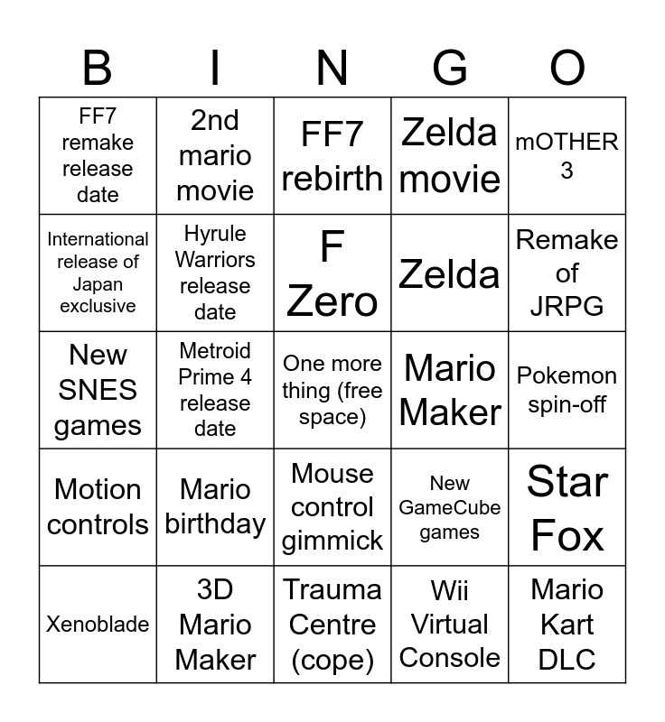 This bingo card has a free space and 29 words: Xenoblade, Fire Emblem, Metroid Prime 4 release date, New NES games, FF7 remake release date, FF7 rebirth, Hyrule Warriors release date, Mario birthday, Mario Maker, 3D Mario Maker, Pokemon spin-off, Mario Kart DLC, Trauma Centre (cope), Wii Virtual Console, Remake of JRPG, Ridiculously long title, Mouse control gimmick, Motion controls, mOTHER 3, New SNES games, New GameCube games, Nintendo RTS, Zelda, International release of Japan exclusive, Zelda movie, 2nd mario movie, Star Fox, F Zero and Nintendogs.