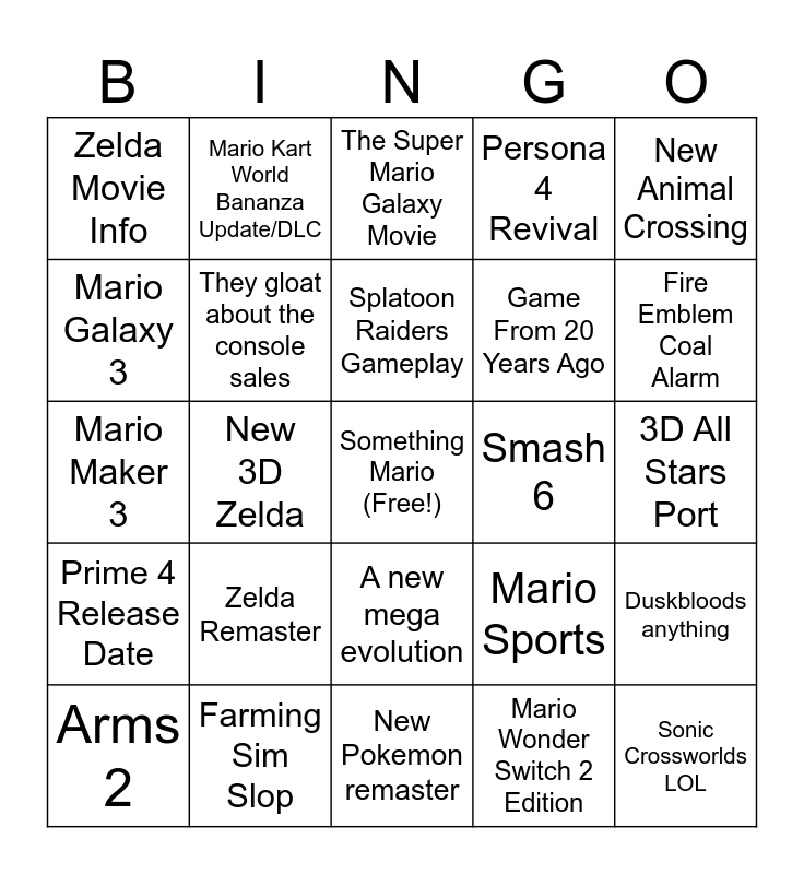This bingo card has a free space and 24 words: Zelda Remaster, Farming Sim Slop, Splatoon Raiders Gameplay, Arms 2, New Animal Crossing, Zelda Movie Info, Mario Galaxy 3, Mario Kart World Bananza Update/DLC, Smash 6, A new mega evolution, Game From 20 Years Ago, Mario Maker 3, Mario Sports, Duskbloods anything, They gloat about the console sales, Mario Wonder Switch 2 Edition, 3D All Stars Port, The Super Mario Galaxy Movie, Fire Emblem Coal Alarm, New 3D Zelda, Sonic Crossworlds LOL, Prime 4 Release Date, Persona 4 Revival and New Pokemon remaster.