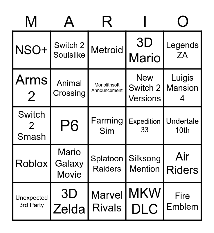 This bingo card has a free space and 26 words: Splatoon Raiders, MKW DLC, Monolithsoft Announcement, 3D Zelda, Legends ZA, NSO+, Arms 2, Switch 2 Soulslike, Undertale 10th, Silksong Mention, New Switch 2 Versions, Switch 2 Smash, Air Riders, Unexpected 3rd Party, P6, XC2 Remake, 3D Mario, Roblox, Metroid, Fire Emblem, Luigis Mansion 4, Marvel Rivals, Expedition 33, Mario Galaxy Movie, Animal Crossing and GTA 6.