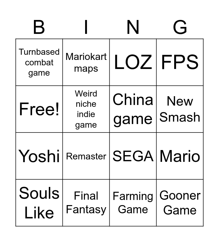 This bingo card has 16 words: Final Fantasy, Mario, LOZ, Turnbased combat game, Yoshi, Mariokart maps, SEGA, Farming Game, Free!, Weird niche indie game, Souls Like, FPS, Remaster, New Smash, China game and Gooner Game.