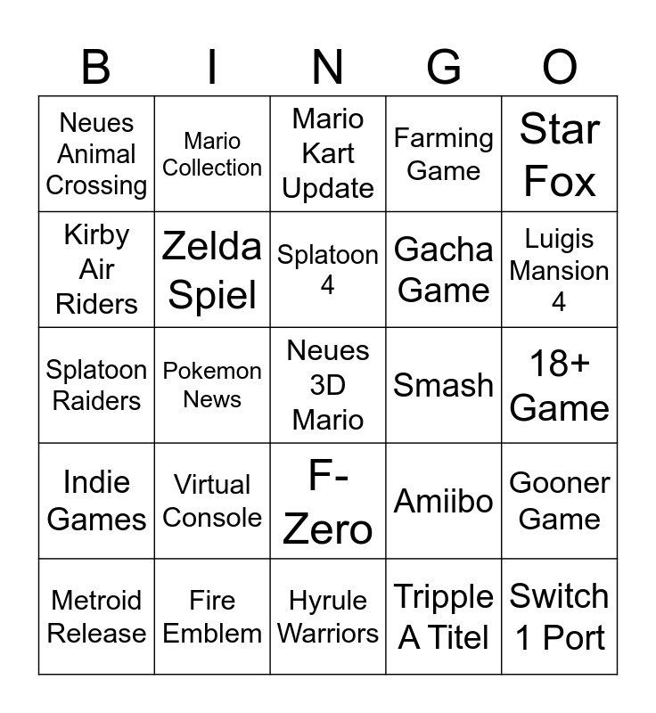 This bingo card has a free space and 24 words: Metroid Release, Virtual Console, Splatoon 4, Tripple A Titel, Star Fox, Neues Animal Crossing, Mario Collection, Mario Kart Update, Smash, 18+ Game, Splatoon Raiders, Zelda Spiel, Amiibo, Gooner Game, Kirby Air Riders, Fire Emblem, Hyrule Warriors, Farming Game, Luigis Mansion 4, Indie Games, Pokemon News, F-Zero, Gacha Game and Switch 1 Port.