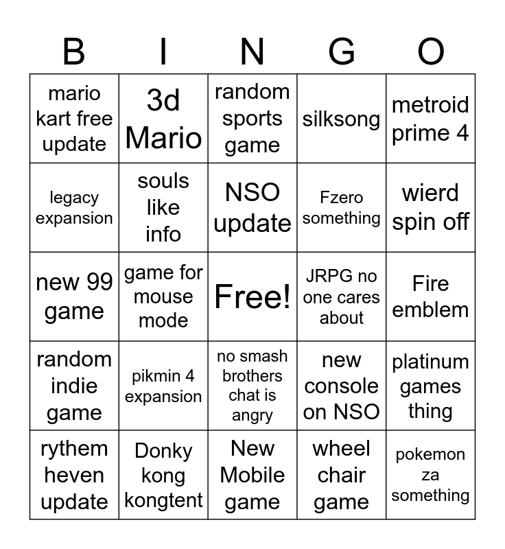 This bingo card has a free space and 24 words: pikmin 4 expansion, Donky kong kongtent, NSO update, rythem heven update, metroid prime 4, mario kart free update, legacy expansion, 3d Mario, JRPG no one cares about, no smash brothers chat is angry, Fzero something, new 99 game, new console on NSO, platinum games thing, souls like info, wheel chair game, Fire emblem, random sports game, wierd spin off, game for mouse mode, pokemon za something, random indie game, silksong and New Mobile game.