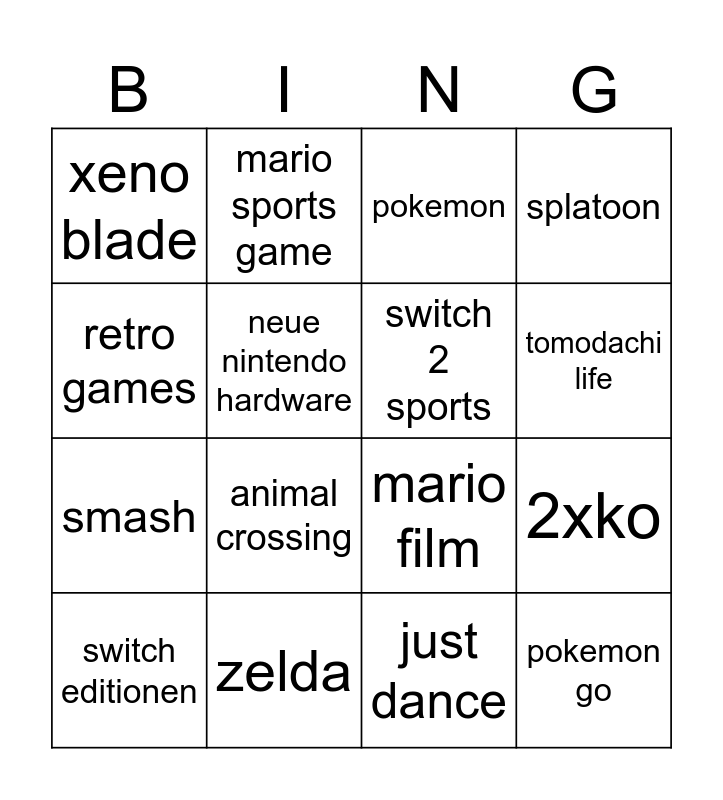 This bingo card has 16 words: zelda, 2xko, pokemon, xeno blade, smash, mario sports game, mario film, just dance, retro games, neue nintendo hardware, switch editionen, splatoon, animal crossing, tomodachi life, switch 2 sports and pokemon go.