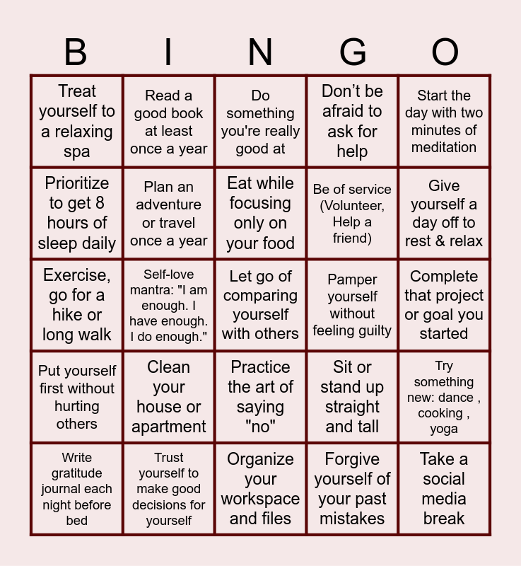 This bingo card has 25 words: Clean your house or apartment, Organize your workspace and files, Eat while focusing only on your food, Write gratitude journal each night before bed, Start the day with two minutes of meditation, Treat yourself to a relaxing spa, Prioritize to get 8 hours of sleep daily, Read a good book at least once a year, Pamper yourself without feeling guilty, Practice the art of saying "no", Be of service (Volunteer, Help a friend), Exercise, go for a hike or long walk, Sit or stand up straight and tall, Try something new: dance , cooking , yoga, Plan an adventure or travel once a year, Take a social media break, Complete that project or goal you started, Do something you're really good at, Give yourself a day off to rest & relax, Self-love mantra: "I am enough. I have enough. I do enough.", Let go of comparing yourself with others, Trust yourself to make good decisions for yourself, Put yourself first without hurting others, Don’t be afraid to ask for help and Forgive yourself of your past mistakes.