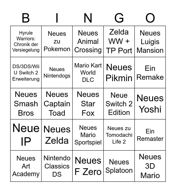 This bingo card has 25 words: Neues Zelda, Neues F Zero, Mario Kart World DLC, Neues Art Academy, Neues Luigis Mansion, Hyrule Warriors: Chronik der Versiegelung, DS/3DS/Wii U Switch 2 Erweiterung, Neues zu Pokemon, Neue Switch 2 Edition, Neues Mario Sportspiel, Neues Pikmin, Neues Smash Bros, Neues zu Tomodachi Life 2, Ein Remaster, Neues Nintendogs, Neues 3D Mario, Neues Yoshi, Neues Animal Crossing, Ein Remake, Neues Captain Toad, Neues Star Fox, Nintendo Classics DS, Neue IP, Zelda WW + TP Port and Neues Splatoon.