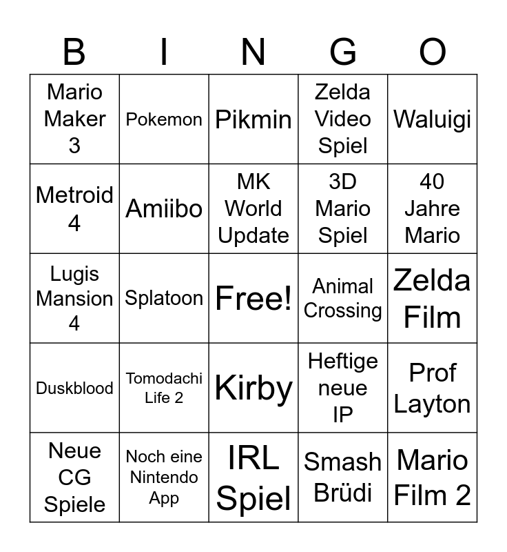 This bingo card has a free space and 24 words: Tomodachi Life 2, Noch eine Nintendo App, MK World Update, Neue CG Spiele, Waluigi, Mario Maker 3, Metroid 4, Pokemon, Animal Crossing, Kirby, 3D Mario Spiel, Lugis Mansion 4, Heftige neue IP, Prof Layton, Amiibo, Smash Brüdi, Zelda Film, Pikmin, 40 Jahre Mario, Splatoon, Mario Film 2, Duskblood, Zelda Video Spiel and IRL Spiel.