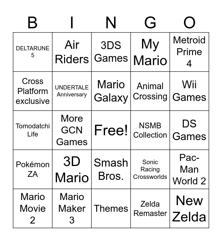This bingo card has a free space and 24 words: 3D Mario, Mario Maker 3, Mario Galaxy, Mario Movie 2, Metroid Prime 4, DELTARUNE 5, Cross Platform exclusive, Air Riders, NSMB Collection, Smash Bros., Animal Crossing, Tomodatchi Life, Sonic Racing Crossworlds, Pac-Man World 2, UNDERTALE Anniversary, Zelda Remaster, DS Games, 3DS Games, Wii Games, More GCN Games, New Zelda, Pokémon ZA, My Mario and Themes.