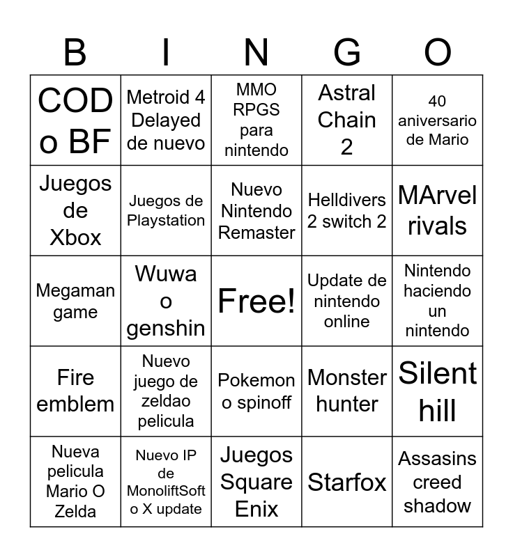 This bingo card has a free space and 24 words: Nuevo juego de zeldao pelicula, Nuevo IP de MonoliftSoft o X update, Nuevo Nintendo Remaster, Nueva pelicula Mario O Zelda, 40 aniversario de Mario, COD o BF, Juegos de Xbox, Metroid 4 Delayed de nuevo, Update de nintendo online, Pokemon o spinoff, Helldivers 2 switch 2, Megaman game, Monster hunter, Silent hill, Juegos de Playstation, Starfox, Nintendo haciendo un nintendo, MMO RPGS para nintendo, MArvel rivals, Wuwa o genshin, Assasins creed shadow, Fire emblem, Astral Chain 2 and Juegos Square Enix.