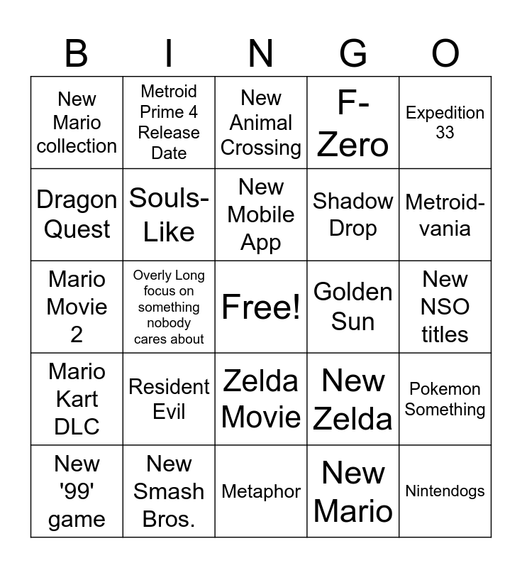 This bingo card has a free space and 24 words: Resident Evil, New Smash Bros., New Mobile App, New '99' game, Expedition 33, New Mario collection, Dragon Quest, Metroid Prime 4 Release Date, Golden Sun, Zelda Movie, Shadow Drop, Mario Movie 2, New Zelda, Pokemon Something, Souls-Like, New Mario, New NSO titles, New Animal Crossing, Metroid-vania, Overly Long focus on something nobody cares about, Nintendogs, Mario Kart DLC, F-Zero and Metaphor.