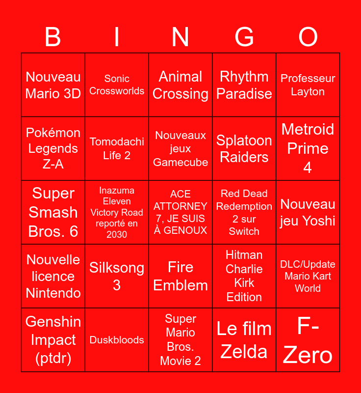This bingo card has a free space and 24 words: Silksong 3, Duskbloods, Nouveaux jeux Gamecube, Genshin Impact (ptdr), Professeur Layton, Nouveau Mario 3D, Pokémon Legends Z-A, Sonic Crossworlds, Red Dead Redemption 2 sur Switch, Fire Emblem, Splatoon Raiders, Super Smash Bros. 6, Hitman Charlie Kirk Edition, DLC/Update Mario Kart World, Tomodachi Life 2, Le film Zelda, Nouveau jeu Yoshi, Animal Crossing, Metroid Prime 4, Inazuma Eleven Victory Road reporté en 2030, F-Zero, Nouvelle licence Nintendo, Rhythm Paradise and Super Mario Bros. Movie 2.