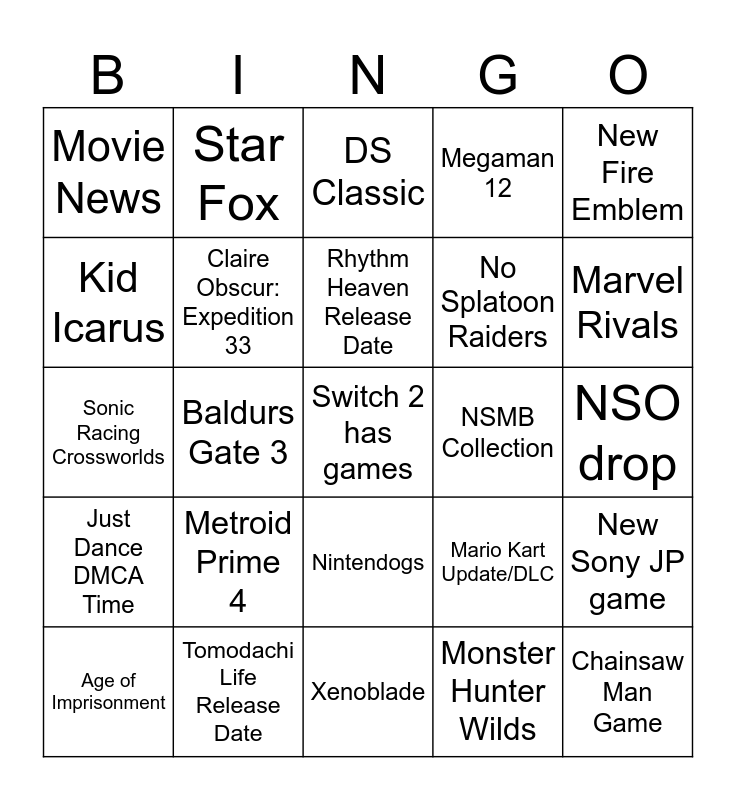 This bingo card has a free space and 24 words: Metroid Prime 4, Tomodachi Life Release Date, Rhythm Heaven Release Date, Age of Imprisonment, New Fire Emblem, Movie News, Kid Icarus, Star Fox, NSMB Collection, Nintendogs, No Splatoon Raiders, Sonic Racing Crossworlds, Mario Kart Update/DLC, New Sony JP game, Claire Obscur: Expedition 33, Monster Hunter Wilds, NSO drop, DS Classic, Marvel Rivals, Baldurs Gate 3, Chainsaw Man Game, Just Dance DMCA Time, Megaman 12 and Xenoblade.