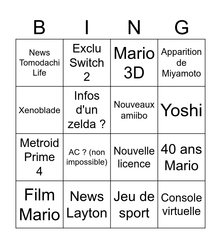 This bingo card has 16 words: News Layton, 40 ans Mario, Mario 3D, News Tomodachi Life, Metroid Prime 4, Exclu Switch 2, Nouvelle licence, Jeu de sport, Xenoblade, Infos d'un zelda ?, Film Mario, Apparition de Miyamoto, AC ? (non impossible), Yoshi, Nouveaux amiibo and Console virtuelle.