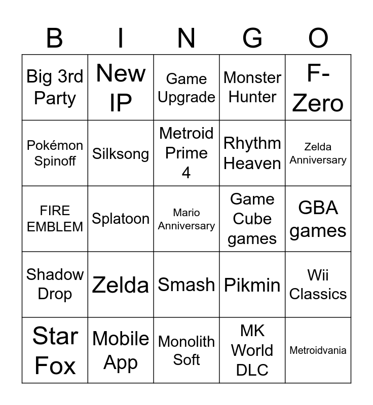 This bingo card has a free space and 24 words: Zelda, Mobile App, Metroid Prime 4, Star Fox, F-Zero, Big 3rd Party, Pokémon Spinoff, New IP, Game Cube games, Smash, Rhythm Heaven, FIRE EMBLEM, Pikmin, Wii Classics, Silksong, MK World DLC, GBA games, Game Upgrade, Zelda Anniversary, Splatoon, Metroidvania, Shadow Drop, Monster Hunter and Monolith Soft.