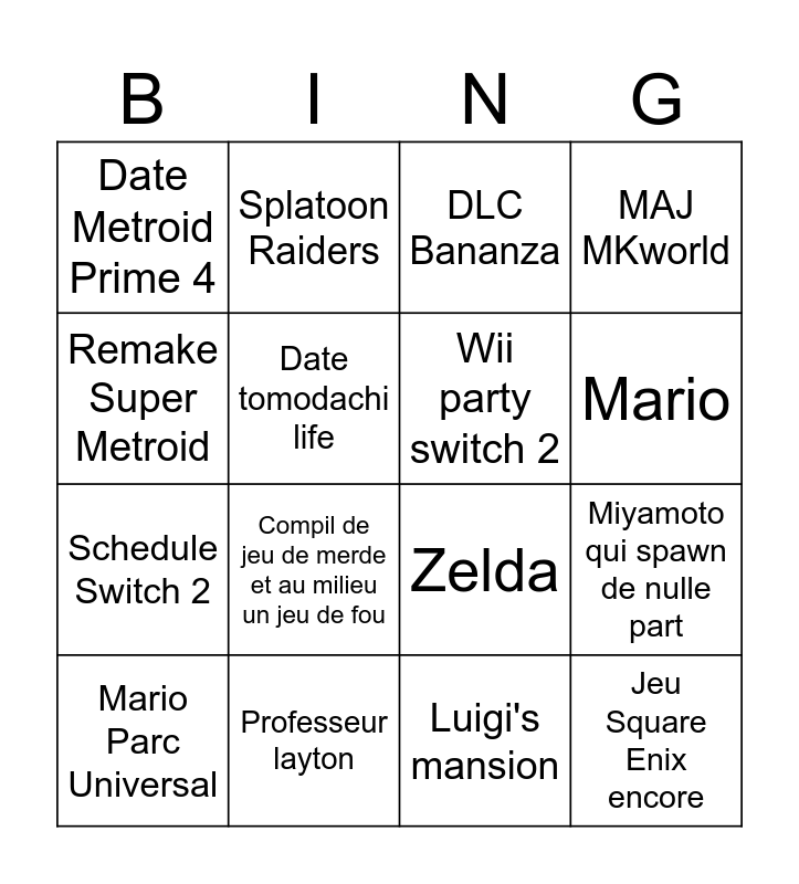 This bingo card has 16 words: Professeur layton, Miyamoto qui spawn de nulle part, DLC Bananza, Date Metroid Prime 4, Schedule Switch 2, Splatoon Raiders, Zelda, Luigi's mansion, Remake Super Metroid, Date tomodachi life, Mario Parc Universal, MAJ MKworld, Compil de jeu de merde et au milieu un jeu de fou, Mario, Wii party switch 2 and Jeu Square Enix encore.