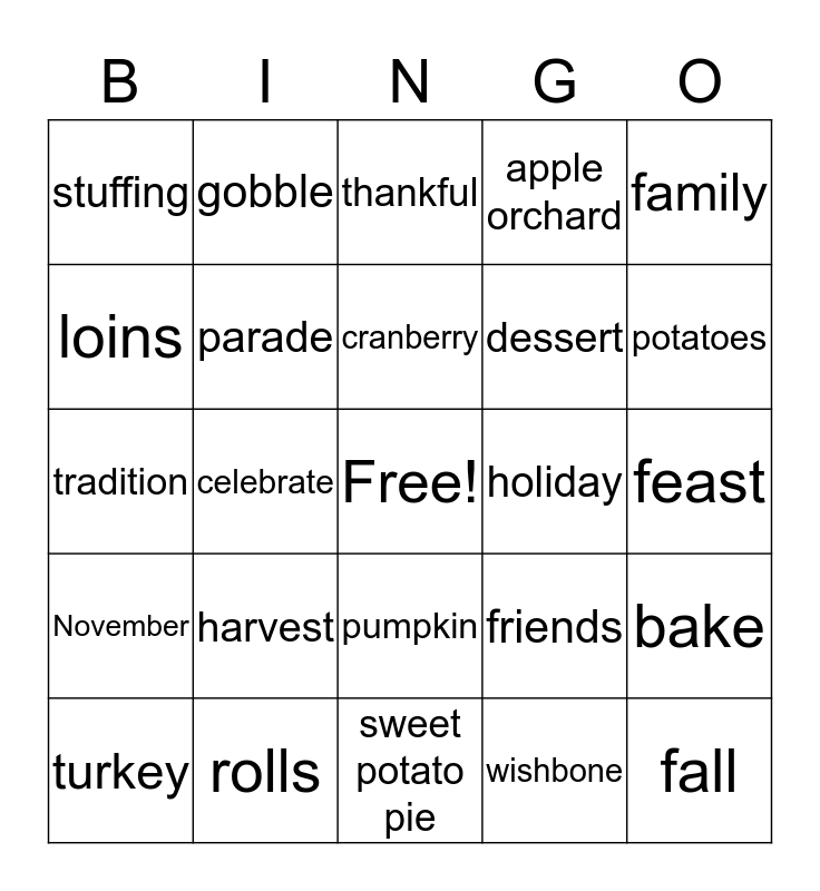 This bingo card has a free space and 24 words: harvest, rolls, cranberry, turkey, family, stuffing, loins, gobble, holiday, pumpkin, dessert, tradition, friends, bake, parade, wishbone, feast, thankful, potatoes, celebrate, fall, November, apple orchard and sweet potato pie.