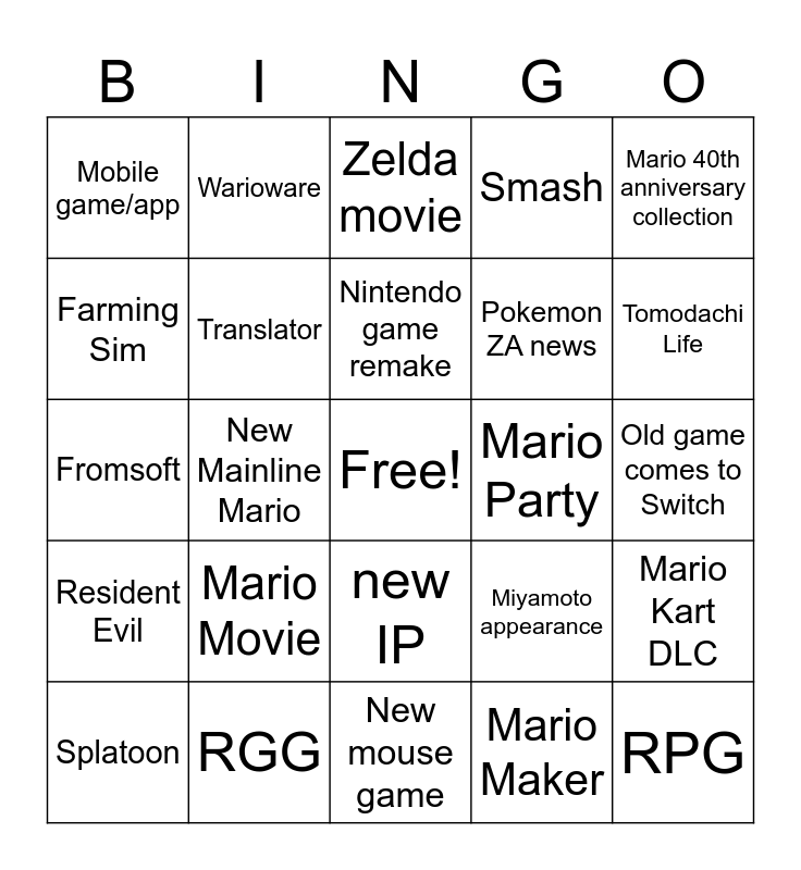 This bingo card has a free space and 24 words: Mario Movie, RGG, Nintendo game remake, Splatoon, Mario 40th anniversary collection, Mobile game/app, Farming Sim, Warioware, Mario Party, new IP, Pokemon ZA news, Fromsoft, Miyamoto appearance, Mario Kart DLC, Translator, Mario Maker, Old game comes to Switch, Zelda movie, Tomodachi Life, New Mainline Mario, RPG, Resident Evil, Smash and New mouse game.