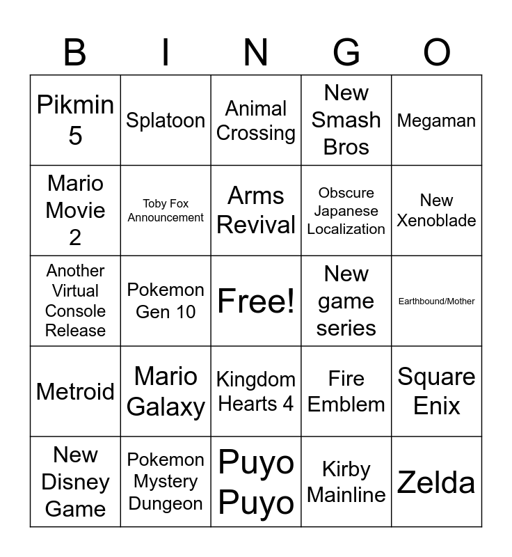 This bingo card has a free space and 24 words: Mario Galaxy, Pokemon Mystery Dungeon, Arms Revival, New Disney Game, Megaman, Pikmin 5, Mario Movie 2, Splatoon, New game series, Kingdom Hearts 4, Obscure Japanese Localization, Another Virtual Console Release, Fire Emblem, Square Enix, Toby Fox Announcement, Kirby Mainline, Earthbound/Mother, Animal Crossing, New Xenoblade, Pokemon Gen 10, Zelda, Metroid, New Smash Bros and Puyo Puyo.