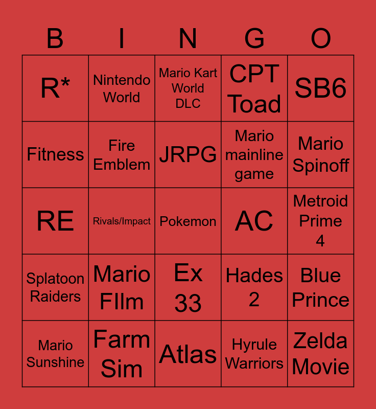 This bingo card has a free space and 24 words: Mario FIlm, Farm Sim, JRPG, Mario Sunshine, SB6, R*, Fitness, Nintendo World, AC, Ex 33, Mario mainline game, RE, Hades 2, Blue Prince, Fire Emblem, Hyrule Warriors, Metroid Prime 4, Mario Kart World DLC, Mario Spinoff, Rivals/Impact, Zelda Movie, Splatoon Raiders, CPT Toad and Atlas.