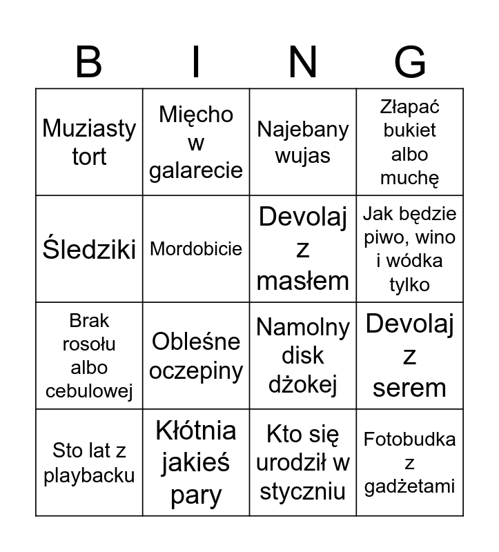 This bingo card has 17 words: Kto się urodził w styczniu, Sto lat z playbacku, Najebany wujas, Muziasty tort, Obleśne oczepiny, Złapać bukiet albo muchę, Devolaj z serem, Devolaj z masłem, Jak będzie piwo, wino i wódka tylko, Mordobicie, Kłótnia jakieś pary, Namolny disk dżokej, Śledziki, Mięcho w galarecie, Brak rosołu albo cebulowej, Cudownych rodziców mam and Fotobudka z gadżetami.