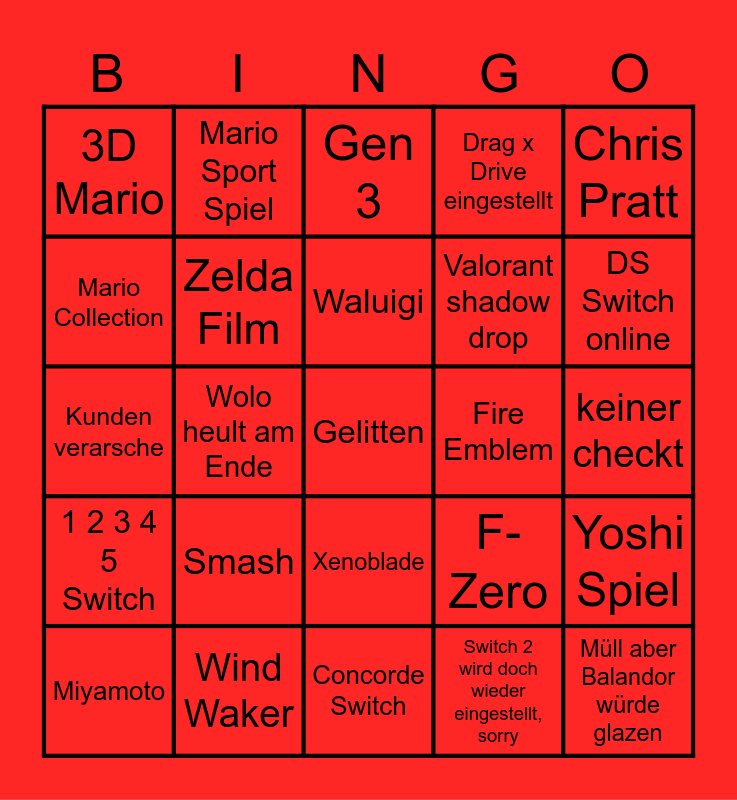 This bingo card has a free space and 24 words: Smash, Wind Waker, Waluigi, Miyamoto, Chris Pratt, 3D Mario, Mario Collection, Mario Sport Spiel, Fire Emblem, Xenoblade, Valorant shadow drop, Kunden verarsche, F-Zero, Yoshi Spiel, Zelda Film, Switch 2 wird doch wieder eingestellt, sorry, keiner checkt, Gen 3, DS Switch online, Wolo heult am Ende, Müll aber Balandor würde glazen, 1 2 3 4 5 Switch, Drag x Drive eingestellt and Concorde Switch.