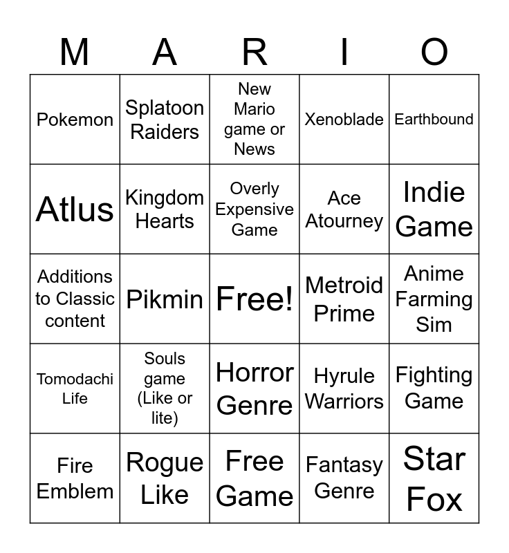 This bingo card has a free space and 24 words: Souls game (Like or lite), Rogue Like, Overly Expensive Game, Fire Emblem, Earthbound, Pokemon, Atlus, Splatoon Raiders, Metroid Prime, Horror Genre, Ace Atourney, Additions to Classic content, Hyrule Warriors, Fighting Game, Kingdom Hearts, Fantasy Genre, Anime Farming Sim, New Mario game or News, Indie Game, Pikmin, Star Fox, Tomodachi Life, Xenoblade and Free Game.