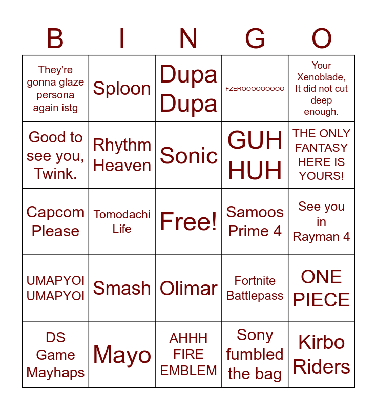 This bingo card has a free space and 24 words: Smash, Mayo, Sonic, DS Game Mayhaps, Your Xenoblade, It did not cut deep enough., They're gonna glaze persona again istg, Good to see you, Twink., Sploon, Samoos Prime 4, Olimar, GUH HUH, Capcom Please, Fortnite Battlepass, ONE PIECE, Rhythm Heaven, Sony fumbled the bag, See you in Rayman 4, Dupa Dupa, THE ONLY FANTASY HERE IS YOURS!, Tomodachi Life, Kirbo Riders, UMAPYOI UMAPYOI, FZEROOOOOOOOO and AHHH FIRE EMBLEM.