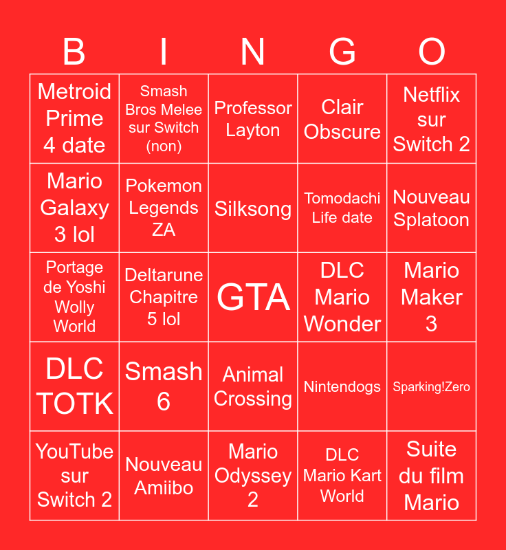 This bingo card has 25 words: Smash 6, Mario Odyssey 2, Silksong, YouTube sur Switch 2, Netflix sur Switch 2, Metroid Prime 4 date, Mario Galaxy 3 lol, Smash Bros Melee sur Switch (non), DLC Mario Wonder, Animal Crossing, Tomodachi Life date, Portage de Yoshi Wolly World, Nintendogs, Sparking!Zero, Pokemon Legends ZA, Suite du film Mario, Mario Maker 3, Professor Layton, Nouveau Splatoon, Deltarune Chapitre 5 lol, GTA, Nouveau Amiibo, DLC TOTK, Clair Obscure and DLC Mario Kart World.