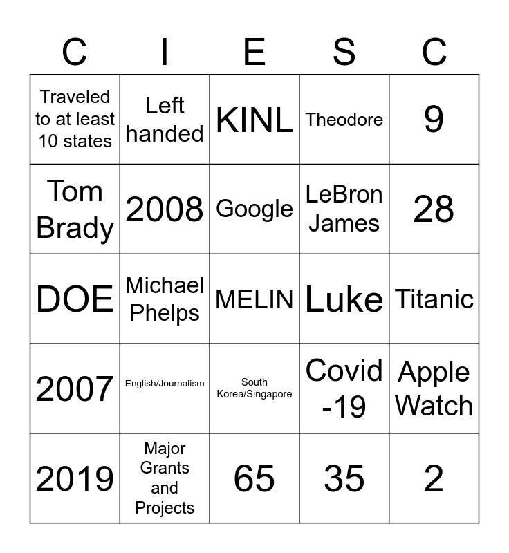 This bingo card has a free space and 44 words: 4, 2, 83, 2019, 10, 35, KINL, Scott, 9, Major Grants and Projects, Theodore, Luke, South Korea/Singapore, English/Journalism, Michigan, 65, Dogs, DOE, 3, 28, Left handed, Speaks 3 languages, Plays a musical instrument, Traveled to at least 10 states, Kelly Clarkson, Titanic, Frozen, George W. Bush, Covid -19, 2007, Artificial Intelligence, Apple Watch, Novak Djokovic, Beijing, China, Michael Phelps, Bitcoin, Jan. 1, 2000, Wikipedia, Google, Tom Brady, LeBron James, TikTok, 2008 and Iraq War.