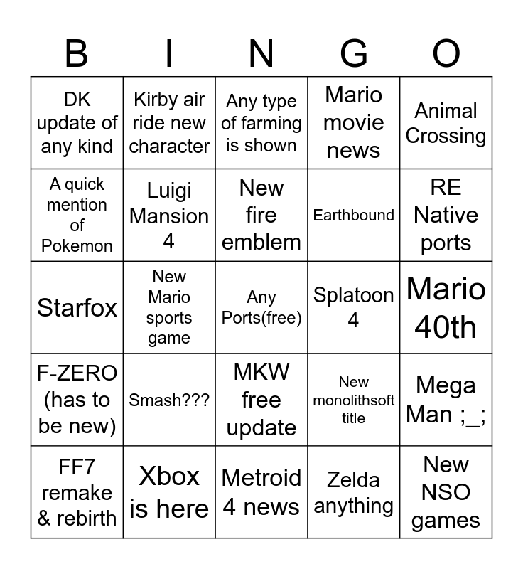 This bingo card has a free space and 24 words: Smash???, Xbox is here, New fire emblem, FF7 remake & rebirth, Animal Crossing, DK update of any kind, A quick mention of Pokemon, Kirby air ride new character, Splatoon 4, MKW free update, Earthbound, Starfox, New monolithsoft title, Mega Man ;_;, Luigi Mansion 4, Zelda anything, Mario 40th, Any type of farming is shown, RE Native ports, New Mario sports game, New NSO games, F-ZERO (has to be new), Mario movie news and Metroid 4 news.
