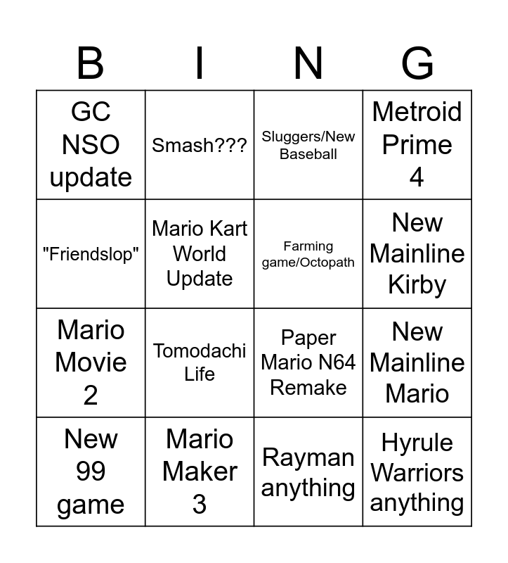 This bingo card has 17 words: New 99 game, Mario Maker 3, Sluggers/New Baseball, Metroid Prime 4, Mario Movie 2, Mario Kart World Update, Paper Mario N64 Remake, New Mainline Kirby, "Friendslop", Tomodachi Life, Rayman anything, New Mainline Mario, GC NSO update, Smash???, Farming game/Octopath, Hyrule Warriors anything and Rhythm Heaven news.