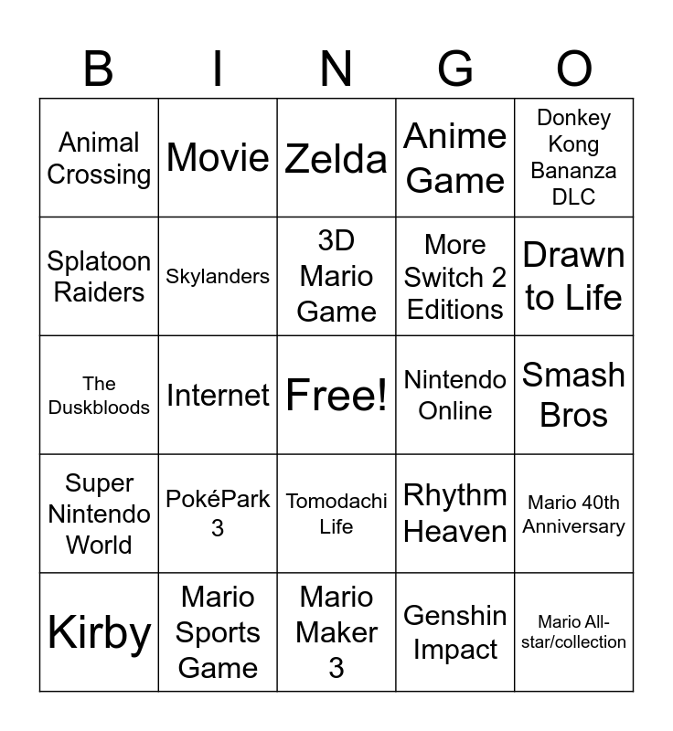 This bingo card has a free space and 24 words: PokéPark 3, Mario Sports Game, 3D Mario Game, Kirby, Donkey Kong Bananza DLC, Animal Crossing, Splatoon Raiders, Movie, Nintendo Online, Tomodachi Life, More Switch 2 Editions, The Duskbloods, Rhythm Heaven, Mario 40th Anniversary, Skylanders, Genshin Impact, Smash Bros, Zelda, Drawn to Life, Internet, Mario All-star/collection, Super Nintendo World, Anime Game and Mario Maker 3.