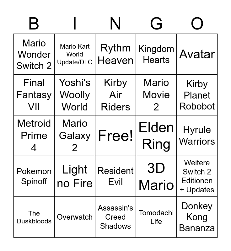 This bingo card has a free space and 24 words: Light no Fire, Overwatch, Kirby Air Riders, The Duskbloods, Avatar, Mario Wonder Switch 2, Final Fantasy VII, Mario Kart World Update/DLC, Elden Ring, Resident Evil, Mario Movie 2, Metroid Prime 4, 3D Mario, Weitere Switch 2 Editionen + Updates, Yoshi's Woolly World, Tomodachi Life, Hyrule Warriors, Rythm Heaven, Kirby Planet Robobot, Mario Galaxy 2, Donkey Kong Bananza, Pokemon Spinoff, Kingdom Hearts and Assassin's Creed Shadows.