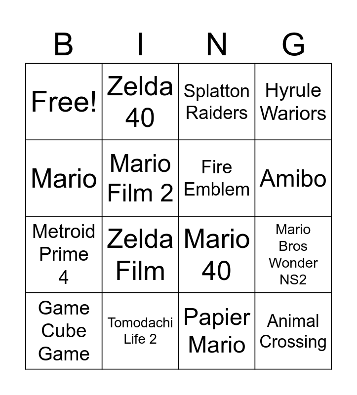 This bingo card has 16 words: Game Cube Game, Tomodachi Life 2, Splatton Raiders, Hyrule Wariors, Mario, Zelda 40, Mario 40, Mario Bros Wonder NS2, Free!, Mario Film 2, Papier Mario, Amibo, Metroid Prime 4, Zelda Film, Fire Emblem and Animal Crossing.
