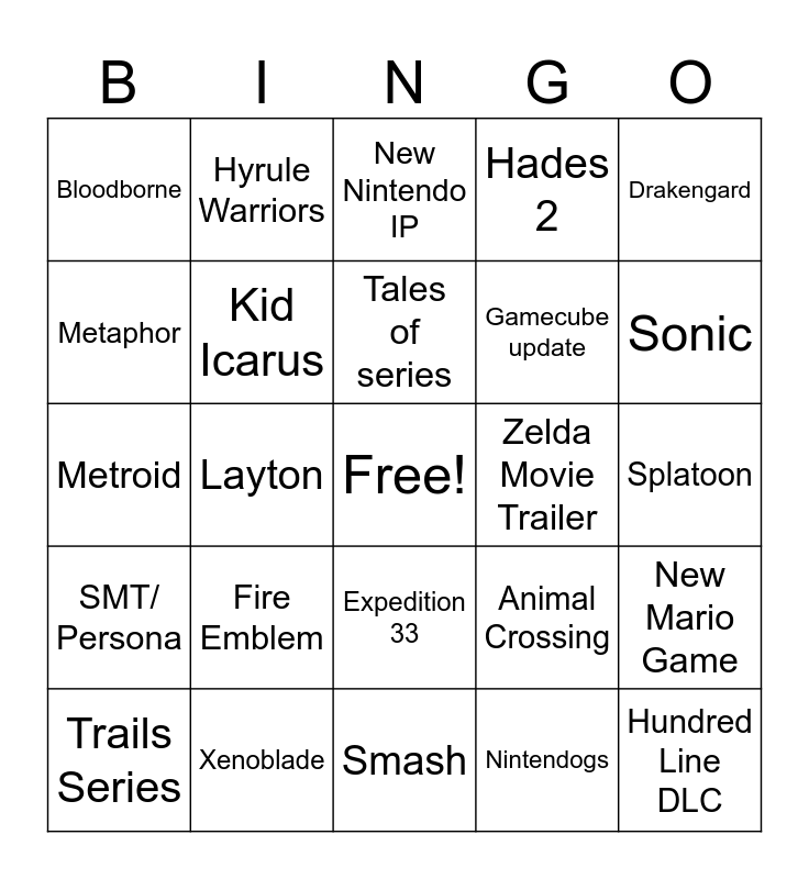 This bingo card has a free space and 24 words: Fire Emblem, Xenoblade, Tales of series, Trails Series, Drakengard, Bloodborne, Metaphor, Hyrule Warriors, Zelda Movie Trailer, Expedition 33, Gamecube update, Metroid, Animal Crossing, New Mario Game, Kid Icarus, Nintendogs, Splatoon, New Nintendo IP, Sonic, Layton, Hundred Line DLC, SMT/ Persona, Hades 2 and Smash.