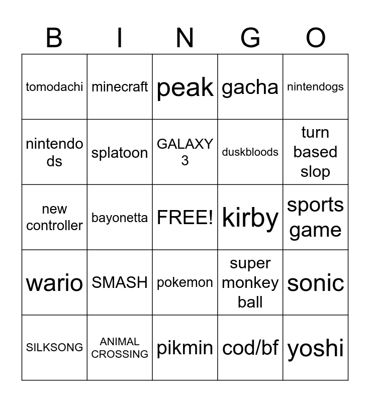 This bingo card has a free space and 24 words: SMASH, ANIMAL CROSSING, GALAXY 3, SILKSONG, nintendogs, tomodachi, nintendo ds, minecraft, kirby, pokemon, duskbloods, new controller, super monkey ball, sonic, splatoon, cod/bf, sports game, peak, turn based slop, bayonetta, yoshi, wario, gacha and pikmin.