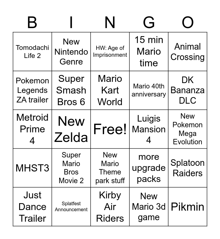 This bingo card has a free space and 24 words: Super Mario Bros Movie 2, Splatfest Announcement, Mario Kart World, Just Dance Trailer, Animal Crossing, Tomodachi Life 2, Pokemon Legends ZA trailer, New Nintendo Genre, Luigis Mansion 4, New Mario Theme park stuff, Mario 40th anniversary, Metroid Prime 4, more upgrade packs, Splatoon Raiders, Super Smash Bros 6, New Mario 3d game, New Pokemon Mega Evolution, HW: Age of Imprisonment, DK Bananza DLC, New Zelda, Pikmin, MHST3, 15 min Mario time and Kirby Air Riders.
