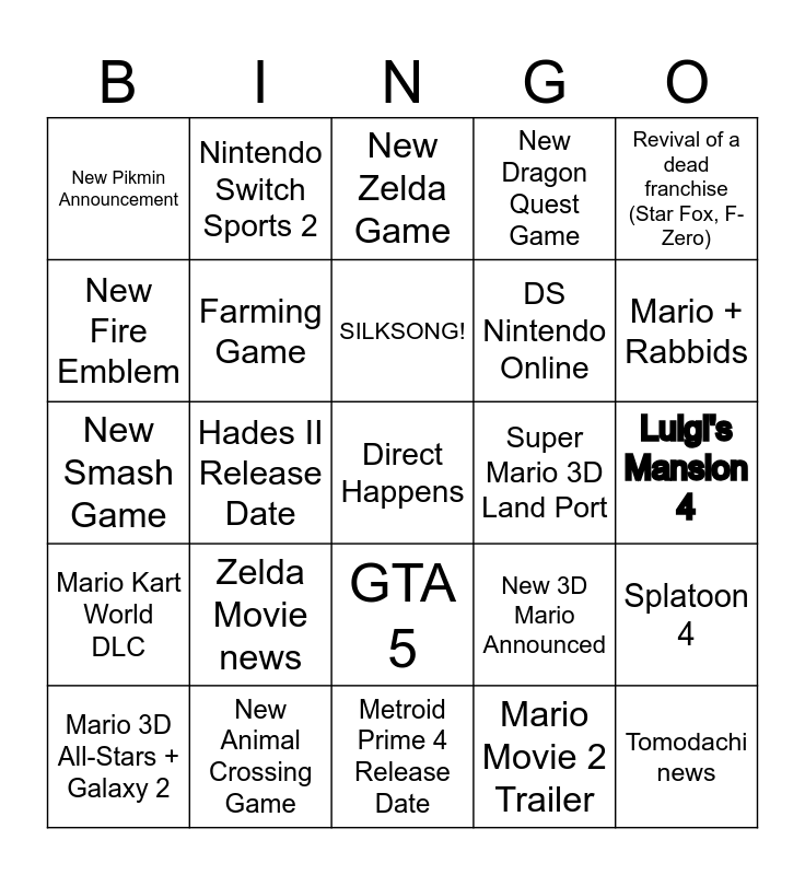 This bingo card has a free space and 24 words: Mario 3D All-Stars + Galaxy 2, Zelda Movie news, SILKSONG!, Mario Movie 2 Trailer, Revival of a dead franchise (Star Fox, F-Zero), New Pikmin Announcement, Nintendo Switch Sports 2, New Zelda Game, Super Mario 3D Land Port, Luigi's Mansion 4, New Smash Game, Farming Game, New 3D Mario Announced, Splatoon 4, New Fire Emblem, New Animal Crossing Game, Metroid Prime 4 Release Date, New Dragon Quest Game, Mario + Rabbids, Mario Kart World DLC, Hades II Release Date, GTA 5, DS Nintendo Online and Tomodachi news.